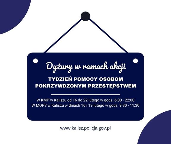 Tradycyjnie już, kaliscy policjanci włączają się w akcję „Tydzień Pomocy Osobom Pokrzywdzonym Przestępstwem”, który w tym roku organizowany jest w dniach od 16 do 22 lutego. Jest to kolejna edycja akcji, podczas której pokrzywdzeni mogą skorzystać bezpłatnie z porad i informacji prawnych, świadczonych przez przedstawicieli różnych instytucji.