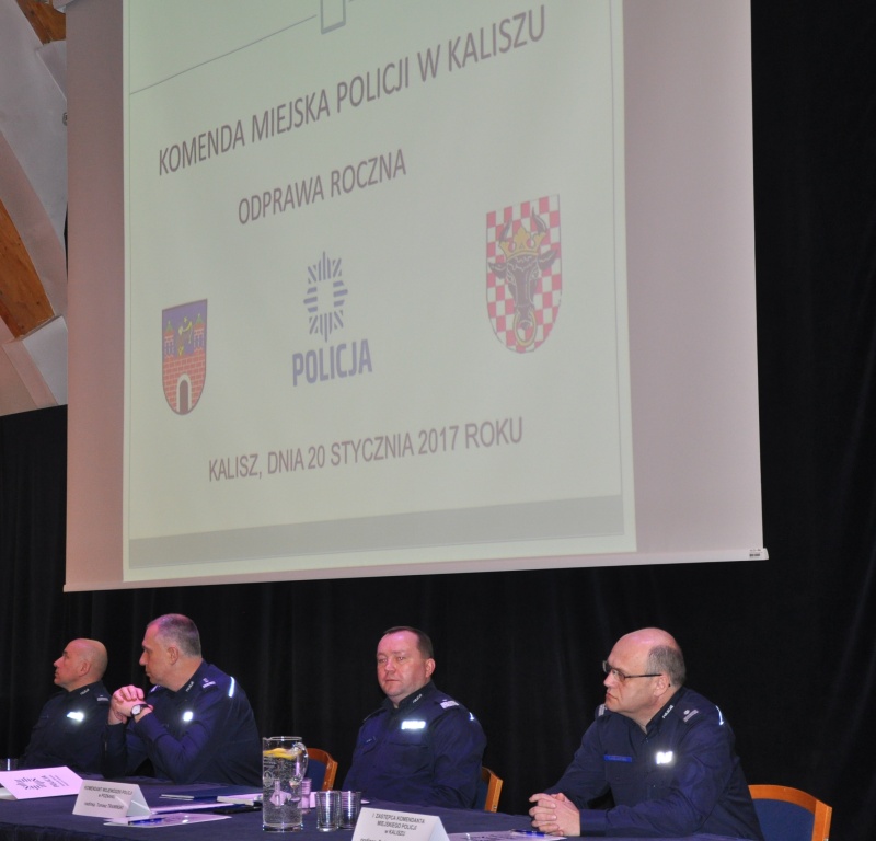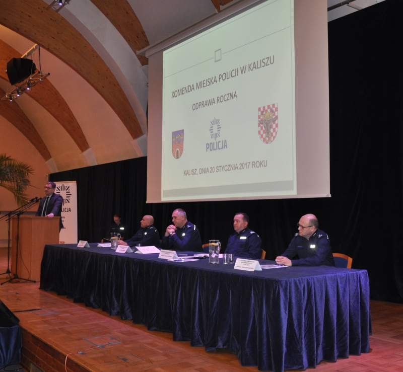 Jednym z elementów odprawy rocznej była ocena stanu bezpieczeństwa na terenie miasta i powiatu kaliskiego za miniony rok. Tegoroczną naradę rozpoczął Komendant Miejski Policji w Kaliszu insp. Dariusz Bieniek, który omówił efektywność działań funkcjonariuszy kaliskiej komendy w 2016 roku oraz przedstawił priorytetowe przedsięwzięcia, jakie będą realizowane w roku następnym.