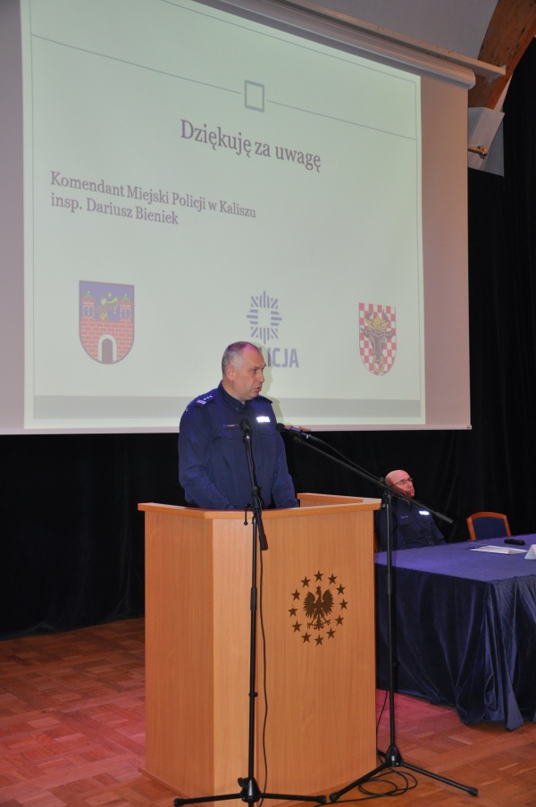 Podczas prezentacji szef kaliskiej jednostki omówił realizację założeń stawianych przed policjantami służby patrolowej oraz ruchu drogowego. Nawiązał również do Krajowej Mapy Zagrożeń Bezpieczeństwa i debat społecznych. Jako kolejny element kontaktu ze społeczeństwem insp. Dariusz Bieniek wskazał realizację programów profilaktycznych m.in.: „Bezpiecznie to wiedzieć i znać”, „Bezpieczne życie seniorów”, „Dopalacze niszczą życie”, „Dwie strony sieci” , „Więzienie stracony czas” oraz „Bezpieczne Dzielnice”.