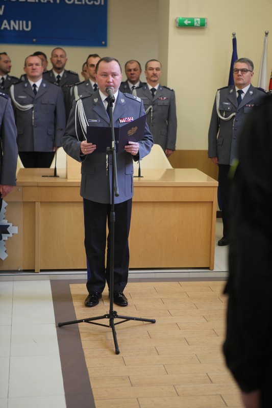 Nadinsp. Tomasz Trawiński powiedział, że służba w Policji to dla nowych policjantów szansa na rozwój, naukę, samokształcenie i spełnianie się. Tylko od policjantów zależy, czy swoją szansę wykorzystają i będą zadowoleni ze służby dla dobra drugiego człowieka. Praca w mundurze wiąże się z ogromnym wyzwaniem, ale i dużą satysfakcją z wykonywanych obowiązków. Komendant zwrócił również uwagę na przestrzeganie zasad etyki zawodowej i dyscypliny. Podziękował także rodzinom nowych policjantów za obecność podczas uroczystości i prosił o wsparcie dla nowych funkcjonariuszy.
