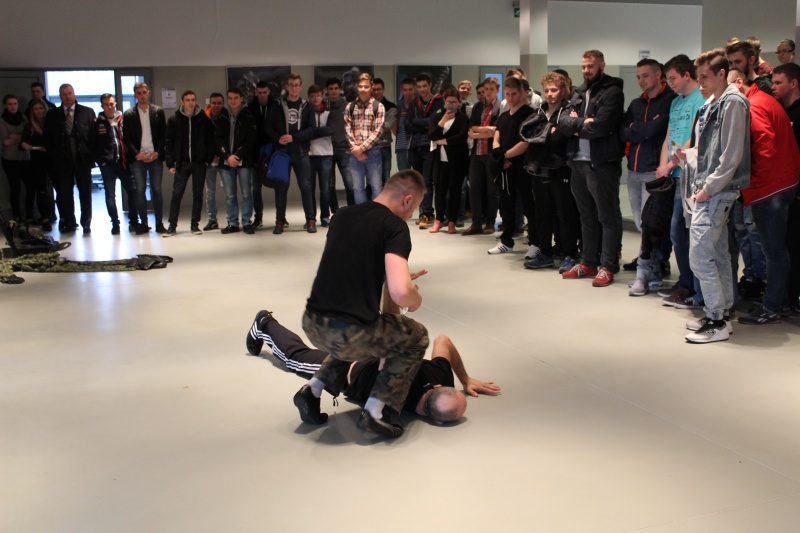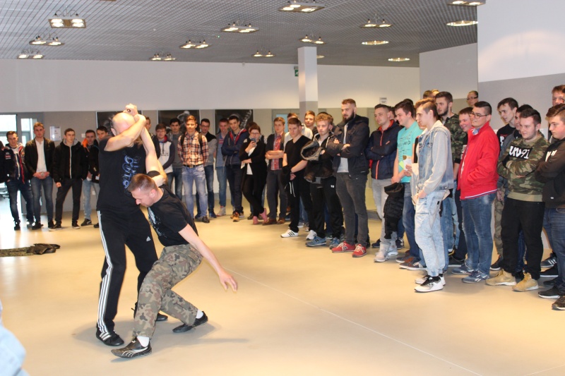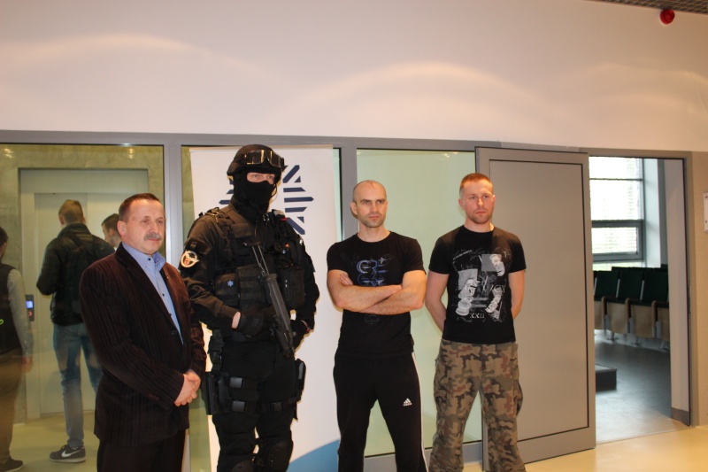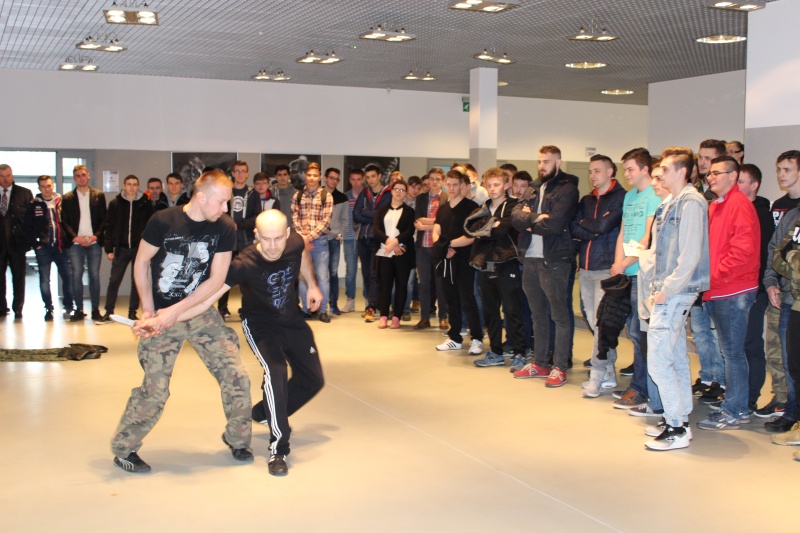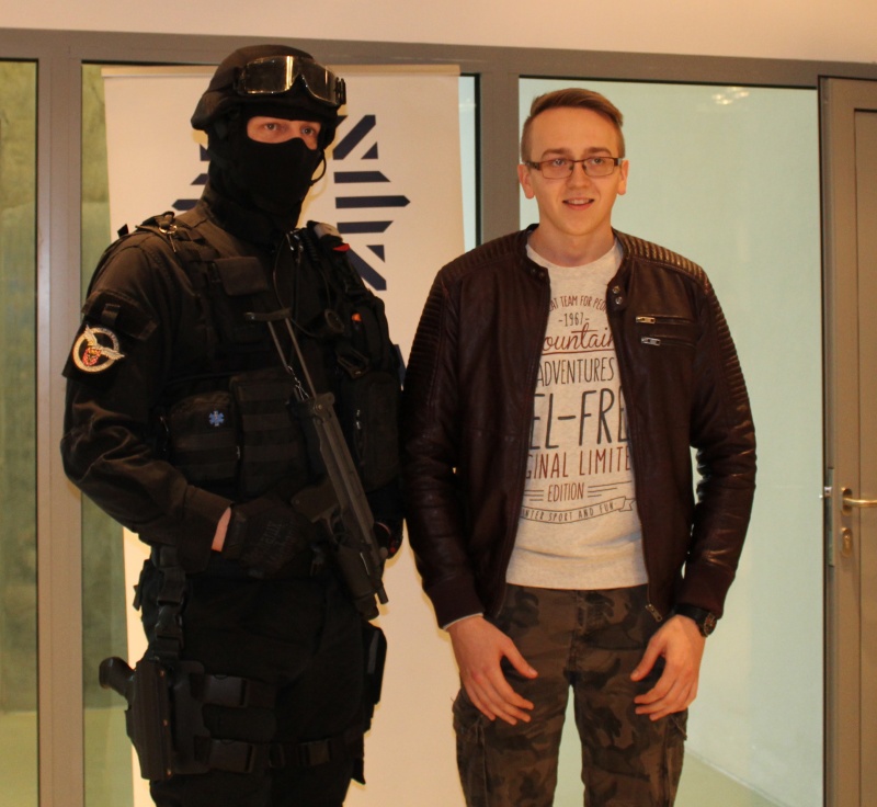 Funkcjonariusze pełniący służbę w Nieetatowej Grupy Realizacyjnej Komendy Miejskiej Policji w Kaliszu przybliżyli uczniom specyfikę swojej pracy oraz zaprezentowali swoje umiejętności. Do ich codziennych obowiązków należy m.in. patrolowanie ulic naszego miasta oraz przeprowadzanie interwencji zgłoszonych na numer alarmowy 997. Ich głównym zadaniem jest obsługa tych najbardziej niebezpiecznych zdarzeń, podczas których zatrzymywane są szczególnie agresywne osoby. Policjanci ci, realizują również zatrzymania na zlecenie wydziałów kryminalnego oraz dochodzeniowo-śledczego. Uczestniczą także w konwojach niebezpiecznych przestępców, zabezpieczają rozprawy sądowe oraz wizyty VIP-ów.