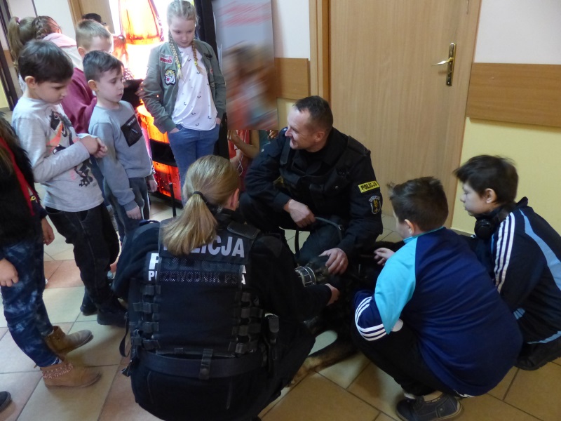 W swoistego rodzaju przewodników zamienili się funkcjonariusze z Zespołu Profilaktyki Społecznej. Stróże prawa opowiedzieli uczniom jak wygląda ich praca oraz pokazali policyjny sprzęt. W tym przypadku zarówno chłopców jak i dziewczynki interesowało dosłownie wszystko. Mali goście odwiedzili techników kryminalistyki, którzy zademonstrowali w jaki sposób działa skaner, służący do pobierania odcisków linii papilarnych. Najmłodsi obejrzeli również sprzęt do robienia zdjęć osób podejrzanych. Dzieci widziały również jedno z najważniejszych miejsc w komendzie czyli stanowisko kierowania. Tam przez kilkanaście minut przyglądały się pracy dyżurnych. Po wizycie w Wydziale Dyżurnych i Operacji Policyjnych goście spotkali się z przewodnikiem psa służbowego oraz jego czworonożną podopieczną. Opiekun „Hery” opowiedział o pracy psów w Policji oraz pokazał, w jaki sposób reagują one na polecenia.