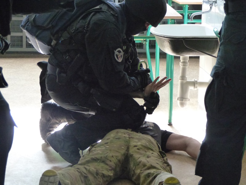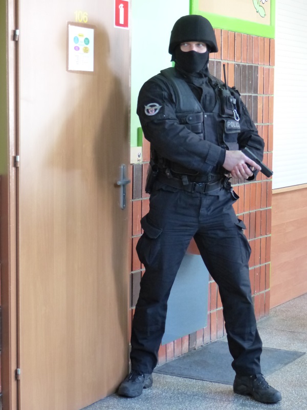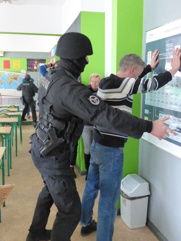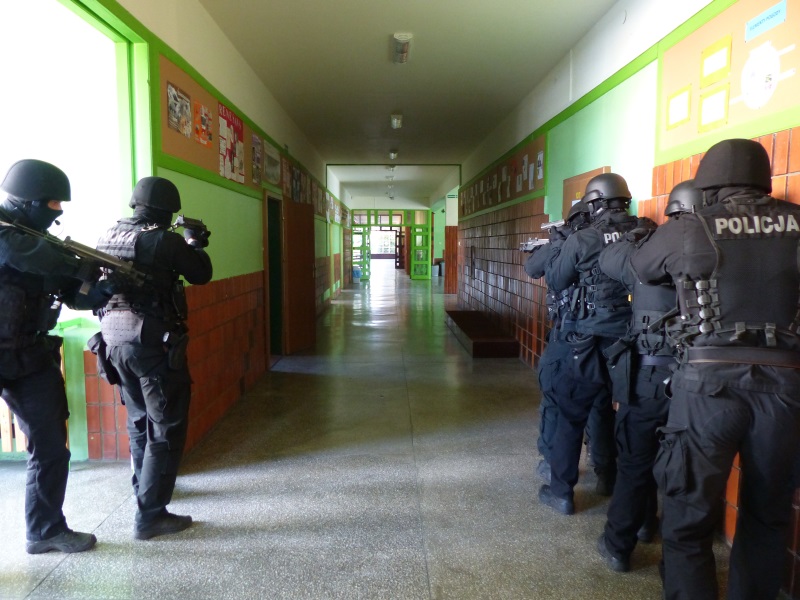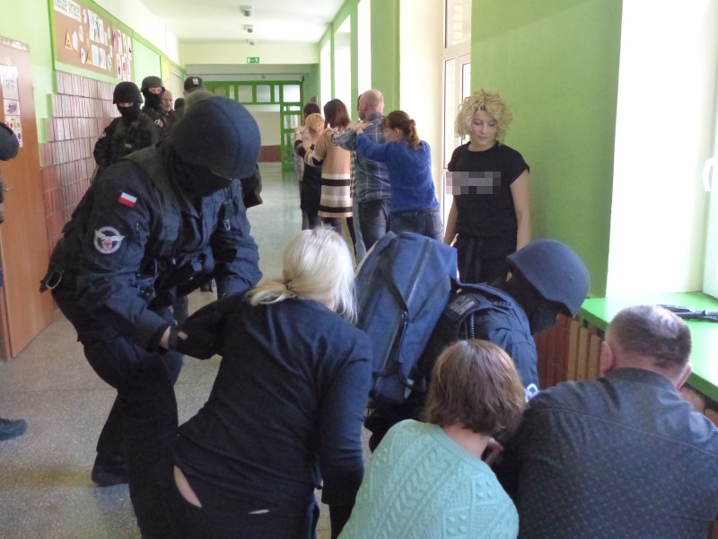 Policjanci z Nieetatowej Grupy Realizacyjnej pojawili się na terenie szkoły, po informacji o wtargnięciu do budynku uzbrojonych napastników. Ich głównym celem było zatrzymanie przestępców oraz odbicie przetrzymywanych w klasach nauczycieli.