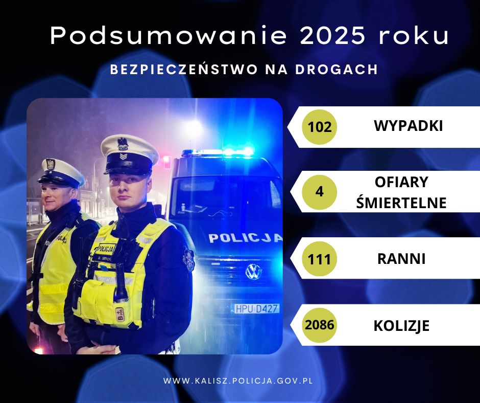 Początek roku to czas na podsumowania tego, co wydarzyło się podczas minionych dwunastu miesięcy. W 2025 roku na drogach miasta Kalisza i powiatu kaliskiego odnotowano 102 wypadki drogowe, w których zginęły 4 osoby, a 111 zostało rannych. Policjanci Komendy Miejskiej Policji w Kaliszu zatrzymali 262 nietrzeźwych kierujących i 263 którzy przekroczyli dozwoloną prędkość w obszarze zabudowanym o ponad 50 km/h.